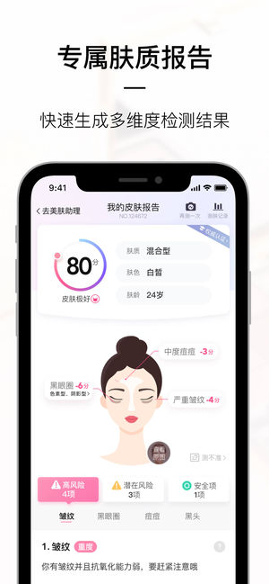 【产品简介】 美图美妆是美图公司孵化的专业美妆智能服务平台,于2017年10月正式上线。基于美图人工智能技术和大数据推出AI测肤功能,让用户通过自拍即可获得专属美肤方案,并结合智能皮肤检测仪深层次检测肌肤问题,开启智能测肤之旅。平台针对用户皮肤问题精准推荐产品,制定专属美肤计划,做每一位用户的随身美肤助理。 美图美妆坚持美图自营,从全球甄选优质美妆品牌,保障100%正品,众安保险承保,假一赔十。 【产品特色】 1.智能测肤,专业分析:美图美妆AI测肤能够通过自拍智能识别用户肤质、肤龄、肤色、黑眼圈、黑头、痘痘(含痘印)、斑点、痤疮等各项皮肤问题,生成专属皮肤分析报告并推荐相应解决方案,…