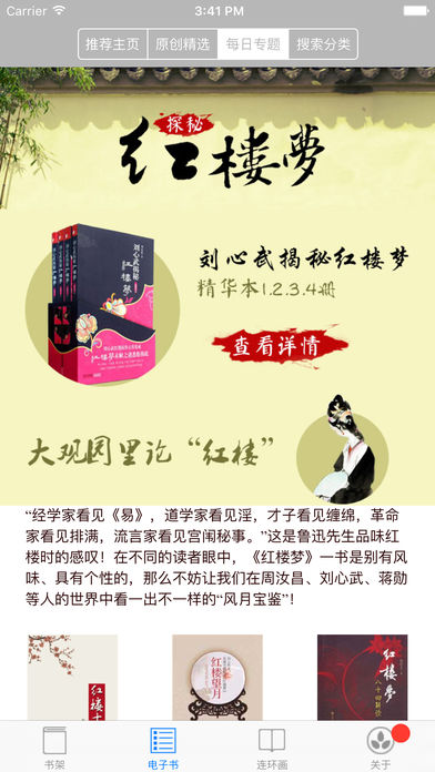 四书五经-精装离线版,支持wifi传书的优质阅读器(ios8,ios9,ios10适配) 《四书五经》 介绍:四书五经是四书和五经的合称,是中国儒家经典的书籍。四书指的是《论语》《孟子》《大学》和《中庸》;而五经指的是《诗经》《尚书》《礼记》《周易》和《春秋》,简称为“诗、书、礼、易、春秋” 【内容简介】 言情、侦探、武侠、总裁、重生、玄幻、宫廷、历史、军事、侦探、小说、职场、奇幻、连环画、杂志等应有尽有 1、热门好书:微微一笑很倾城、翻译官、芈月传、三体、苗疆蛊事、明朝那些事、余罪、镜•沧月出道15周年纪念珍藏版、阿西莫夫经典科幻集、哈利波特、古董局中局、夏有乔木雅望天堂、解忧杂货店、我不喜欢这世界,我只喜欢你、我是个算命先生、怪诞行为学、海伯利安4部曲、红顶商人胡雪岩、王小波全集、白夜行、侯卫东官场笔记、银河帝国、格拉德威尔经典系列、世界通史系列、人类简史:从动物到上帝、从你的全世界路过、道金斯科学经典系列、吕思勉文丛(精校版)、修罗武神、神魂至尊、 终极狂少、绝世战魂、万道独尊、冰与火之歌、魔戒等。 2、经典名著:三国演义、红楼梦、水浒传、西游记、古龙系列、大秦帝国等,更有奇书、绝版名著好书。 2、现代文学:谁的青春不迷茫,小王子、何以笙箫默、匆匆那年、大漠谣、狼图腾、白鹿原等 3、名人传记:乔布斯传、曾国藩传、扎克伯格传、李嘉诚全传、毛泽东传、蒋介石与现代中国等。 4、经济管理:定位、小米:参与感、周鸿祎:我的互联网思维、21世纪资本论、互联网金融、购物、夺宝、秘笈等时下最热的互联网知识。 5、成功励志:谁的青春不迷茫,慢慢来,一切都来得及,如何控制自己的情绪,人性的弱点等。 6、两性情感:何以笙箫默、左耳、第一次搭讪就上手、用男人的思维和男人谈恋爱,我们为什么会分手,魔鬼约会学等。 《订阅条款/Subscription Agreement》 当您购买了自动续订功能后,代表您完全了解并同意以下的相关协议和使用规则: 1.本应用提供订阅会员服务,会员可以仿问所有内容 2.本应用提供的订阅时间长度:一个月、一季度和半年 3.价格:一个月/12RMB;一季度/30RMB;半年/50RMB;一年/93RMB 4.当确认付费后,您的费用将会由iTunes账户收取 5.除非在当次订阅期间结束的24前取消订阅,否则您的订阅将会被收取下次的订阅费用 6.若要关闭续订功能,请至您的iTunes账号管理页面,更改或取消订阅设置