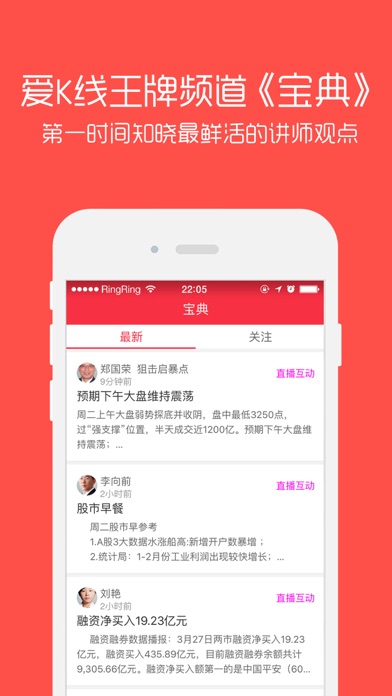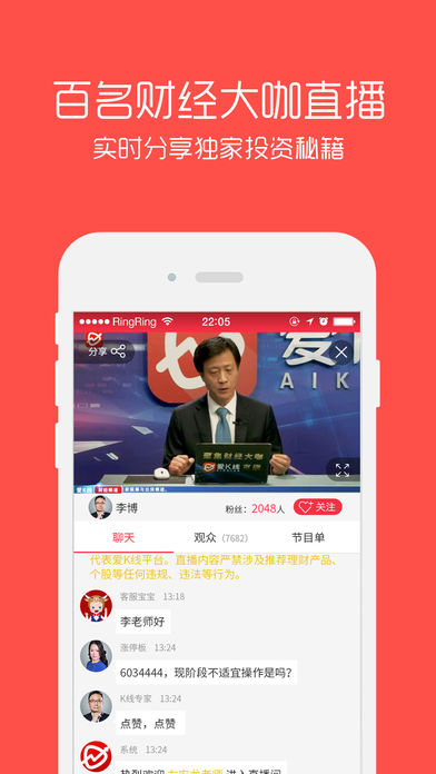 爱K线-汇聚全国知名经济学家、首席金融分析师、财经主持人、股市评论员实盘视频直播,解读股市大盘走势、展望宏观经济形式、剖析当下热门投资热点。 特邀韩云、左安龙、等百名一线财经专家每天为你解密牛股策略,实盘直播教你炒股票! 特色功能 【零距离接触财经专家】与财经专家面对面交流,实时互动,有问必答,实盘直播教你学习投资股票; 【百名专家有问必答】 买入卖出不再纠结,实盘解答持仓问题,免费诊断股票,让实盘操作更加轻松自如; 【捕捉股市热点事件】 爱K线美女财经助理每日视频直播解读A股、港股、美股行情热点,让投资更加及时; 如果您对我们软件有任何建议或意见,欢迎随时联系我们。 爱K线客服QQ:4000252888 关注微信订阅号:aikxian-dy 新浪微博:http://weibo.com/u/5919791702 爱K线-财经直播