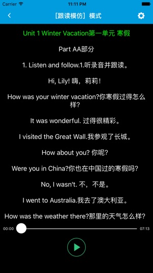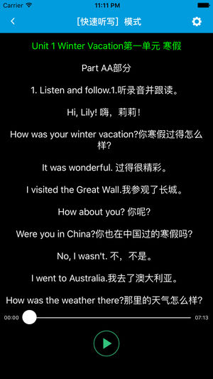 本应用对应闽教版三起点小学英语五年级下学期课本,具有跟读模仿,自动听写,变速播放的复读机功能。 该应用支持跟读模仿,单次播放,单课循环,全部循环和听写的五种模式。它实现了实时评价用户跟读模仿的发音,并根据评价结果决定是否重新跟读。它以盲听跟读为设计原则,用户不需要反复触摸录音播放按钮,而是一键跟读,高效地练习口语。它还实现了单课循环,全部循环和智能分段功能。其中,智能分段可以让您免于寻找回放点,提高听音效率。在听写模式下,它提供了快速,常速和慢速三种模式供您选择。它贯彻了跟读模仿练习英语口语和通过听写练习英语听力的有效学习方法,让更多的学生摆脱哑巴英语,促进听力和口语相互提高,助力英语听力口语…