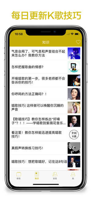 【汇集海量唱歌教学视频,轻松学唱歌,为你打开艺术之门】 收录大量教学视频,可以帮助广大声乐爱好者从零基础开始专业学习现代流行唱法的知识和技巧,通过练习逐渐进行入门提高。科学系统的为您解决高音上不去、低音下不来、气息不够用、音色不好听、唱歌容易累、感情不到位、五音不全等问题,全面提高你的唱歌水平。 细致讲解,跟音频练习,帮助你解决高音上不去、低音下不来、气息不够用、唱歌容易累、音色不好听、没有表现力的问题。简单学几招,让你在K歌时大显身手。 爱唱歌的各位麦霸现在就拿起你的麦克风跟我们一起唱歌喊麦做发声练习吧,让我们一起用心歌唱,追逐梦想!