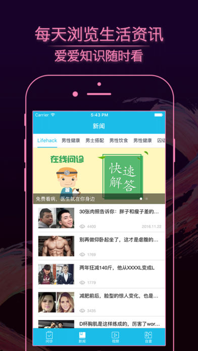 【产品简介】 介绍两性的相关知识和内容。通过算法猜出您的兴趣,向您推荐最适合您的两性知识,同时您也可以向医生进行咨询。 【产品特点】 特点一:海量信息知识,有量且有质量,更新迅速来源站权威 特点二:最先进算法,完全个性化订阅,颠覆你的阅读体验,只看想看的内容 特点三:界面清爽简洁,不同人群应用更贴心 【联系合作】 医疗机构合作 Tel:010-57232324 邮箱:hkw@doumob.com