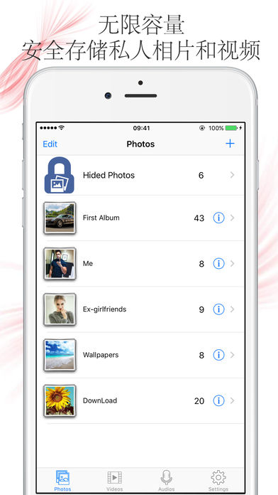 ** 限时免费下载! 你是否正在寻找一个能安全存储私人相片和视频的应用? HiPhoto 可以安全保护您的私人相片和视频以及录音。除此以外,您还可以使用内置的隐私浏览器不留痕浏览网页,并且可以直接将喜欢的图片下载到应用中! HiPhoto 功能强大,性能卓越! * 使用主密码锁住应用,没有您的密码或者你的指纹,任何人无法开启应用; * 应用内支持创建自定义文件夹,您可以给不同的相片视频分类; * 不同文件夹内的相片和视频可以随意相互移动; * 内置功能强大的录音机,可以直接录制并编辑您的私人录音; * 使用苹果系统提供的分享功能,您可以在其他应用中直接把图片存储到本应用; * 使用iTunes方式或者Wi-Fi方式从电脑导入相片视频到手机中; * 独特的隐藏列表可以保存您最隐私的资料; * 可以通过Wi-Fi通信方式直接在电脑端浏览本应用中的文件; …… 幻灯片浏览功能 * 左右滑动浏览切换相片视频; * 拖拽放大和缩小图片,细看局部特写; * 全屏预览播放; * 在幻灯片浏览模式中提供了多种选择:背景音乐、过度模式、循环模式等。 上传备份和传输相片视频 * 你可以通过iTunes/Wi-Fi方式把手机中的相片和电脑中的相片进行同步传输备份; * 你可以通过系统自带的分享功能将图片视频等分享出去; * 你可以直接从系统相册或者别的应用中打开此应用并将需要的图片插入该应用中。 伪装密码功能 * 如果您这款伪装计算器不小心被人发现了,这个令人讨厌的人可能会恳求你打开来看看。这时您只需要告诉他你预先设好的伪装密码,输入伪装密码打开的应用看到的是完全不用的相册! 抓拍入侵者功能 *如果有人发现这款计算器是隐私相册并多次尝试输入密码以解开应用,那么应用会自动抓拍入侵者头像,留下其犯罪证据! 分享功能特性 * 导出相片到系统相册中; * 直接通过邮件发送图片给朋友; * 复制图片或直接将图片复制到信息框中回复朋友短信息; * 可从其他应用中直接打开该应用。 HiPhoto 支持大量主流媒体格式 * 相片:jpg, png, bmp, tif, tiff, jpeg, etc. * 视频:mov, mp4, m4v, mph, etc. * 音频:mp3,wav,aacf, etc. ******************************************* 你的所有相片和视频等文件都仅仅存储于您的设备中,这是100%隐私的。所有数据不会上传到我们的服务器,我们没有任何能力可以获取到您的资料。请百分之百放心使用!