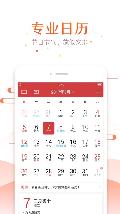 万年历,一门文化,又是一种传统。 看农历查宜忌知天气。一历在手,万历皆有! 【获得荣誉】 1. App Store工具分类持续5年TOP前10!目前用户数量已突破2.5亿!可适配iPhone/iPod/iPad各种机型。 2. 日历产品中权威、准确的万年历App! 【产品简介】 提供公历、农历、天气、日程、黄历、笔记,记事、生日、节日等日历实用功能。 【产品功能】 ①日历:黄历宜忌、节日节气、吉日查询、历史查询; ②提醒:会议、记事、待办、日程管理、生日提醒、日记本; ③天气:天气动态、未来一周天气、PM2.5污染提示; ④特色功能:星座运势、资讯卡片、周公解梦、财喜罗盘、人体节律、生肖运程。 【产品特点】 ①全面的日历查看功能,随时掌握日期,您的时间管理专家! ②界面简洁,不冗余,凸显中国风,做优质准确的中国日历万年历! ③更多实用功能,将365日历 时间与事件结合,高效生活! ④完美继承和延续中国传统文化!适合中国人的中华万年历。 【联系我们】 官网地址:http://51wnl.com 官方微博:http://weibo.com/51wnl QQ群:186720268