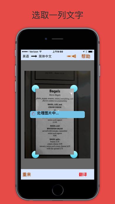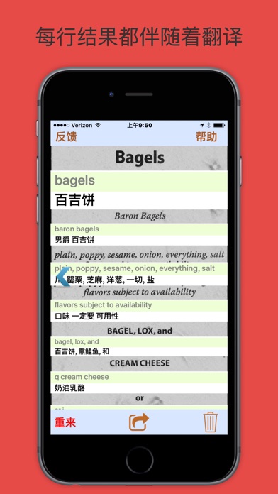《菜单说 (免费版)》把菜单从英语翻译成中文。 让英语菜单点菜更容易。拍照,剪裁,然后翻译。就这么简单。每行英语单词后面紧跟着识别的文字和翻译,让你可以更容易的和服务员交流。 本程序可以免费使用三次,使用时不需要网络连接。但需要有网络才能购买,无限使用。请在出行前购买好。 为什么选择《菜单说 (免费版)》? - 它不仅是单词翻译,而能帮你更容易的点菜。 - 菜单上的每一行都伴随着翻译。当你找到要点的菜的时候,你可以更容易地和服务员交流。 - 它很可靠,能识别绝大部分打印的菜单。 - 它不需要网络连接,所以可以在任何地方使用。 - 它的界面很简单,让你第一次就能上手使用。你也不用担心需要重新学习如何使用它。 - 使用了粗体字,让你更容易读。 更多信息: - 《菜单说 (免费版)》只适用于打印的菜单,而不能用于手写的菜单或者电脑屏幕上的菜单。 - 剪裁菜单成只有一列的 - 从正上方拍照,尽量不要有倾斜角度。 - 为了更好的结果,可以把菜单放在桌子上再拍照。 已知的问题: -对于大部分的菜单,《菜单说 (免费版)》会有一小部分的文字无法识别或者识别错误。 - 我们尽量做到最好的翻译。但是语法很多时候都不是很完美。 - 如果字体太小,《菜单说 (免费版)》在识别的时候会有困难。