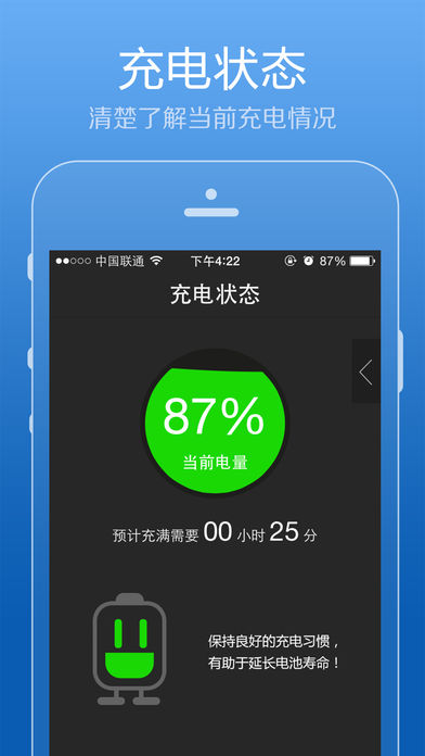 实用便捷的电池管理软件,实时掌握您所需的所有信息。 精心打造完美用户体验,轻松充电的同时更好的维护您的电池。 做您最好的电池维护专家 【准确预估电池可用时间】不用担心外出时电量不足。 【设备信息详细显示】让您更清楚的了解自己设备当前状况! 【绚丽充电屏保】绚丽的动画,让充电也变得很有趣! 【完美适配ios10】完美适配iphone7 我们非常愿意倾听您宝贵的意见: 请在设置中的意见反馈里联系我们或者添加QQ交流群:538547671