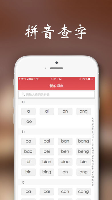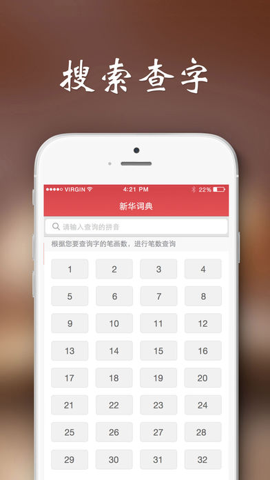 新华词典这是一个查阅20818个汉字(包括简,繁体)的词典程序,是目前为止AppStore中收录汉字*最全*的汉字词典程序。它不但具有笔画,部首索引功能,还具有更强大的逐字搜索能力,一定是您驾驭汉语,提高工作效率的好工具。功能特征: 1,操作简单,不需要网络环境。 只要输入拼音,五笔或汉字,即可查询,并且可根据需要可把检索模式设置为前方一致或部分一致。 是对输入的拼音,还是五笔进行检索,需要用户指定。搜索结果中显示各个汉字的笔画数,部首和五笔的信息。 2,可以根据笔画或部首索引,对每个汉字进行查阅。各个部首根据笔画的多少进行了归类。 3,对每个汉字都有基本解释,有的还同时拥有详细解释,在基本解释画面,触摸详细的连接,就会显示详细解释的画面。 4,强大的逐字搜索功能。在基本或详细解释画面,触摸画面,选择其中任何一个汉字,就会显示有关这个汉字的解释画面,这个操作可以一直持续到您的设备没有内存为止。 敬请注意:1,该程序的内容,仅供参考。2,逐字搜索功能只对选择的第一个汉字有效。3,对于特别稀疏,不能在电子设备上显示的汉字会用[?]来代替。