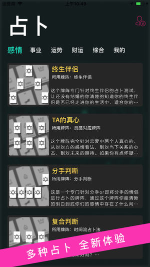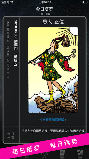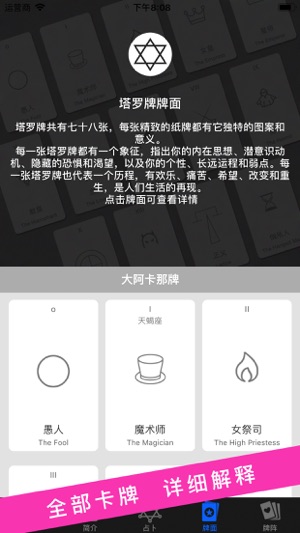 【占卜功能已加入】 【塔罗占卜,占卜未来】 星座运势测一测,恋爱感情算一算,未来事业财富状况一键占卜。 塔罗牌可以针对爱情、人际关系、工作(学业)等不同需求来做分析,预测和提供建议。尤其在不知应采取何种行动的时候,它是一种非常好的提示路标,具有一定的心理暗示功能,由于过于神秘,归于神秘学范畴。并在众多电影中出现,作为电影剧情的重要线索,如《惊天魔盗团》《午夜塔罗牌》《圣杯骑士》等等。 【功能特点】 如同星座八字算命,生辰八字,十二星座运势,紫微斗数,八卦易学,手相面相相学解梦一样,祝你掌握自己的命运! 婚姻感情,事业发展,为你提供专业的预测服务。 在您疑虑,悬而未决的时候,为您提供决断的参考…