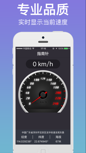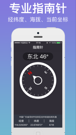 专业手机定位App:提拔精确的经纬度坐标、当前海拨高度、当前所在地理位置。 并且还为您提拔精确的行车速度,实在是您旅游出行的好帮手, 这款专业手机定位App界面美观,数据显示准确。并且操作起来非常简单。相信能给您的生活带来极大的便利。 --软件特色-- 1、实时显示当前方位、经纬度坐标。 2、实时显示当前海拨高度、当前地理位置。 3、实时显示当前行进速度。 4、软件界面设计美观,十分易于操作。