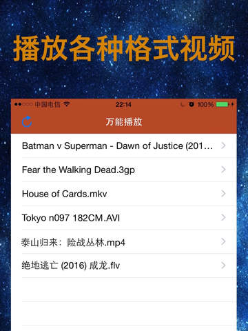 把电脑中的视频导入苹果设备中播放! 影音3d万能播放器是一款性能优异的视频播放软件,为用户提供良好的视频文件播放体验。 您可以把各种下载的影片通过iTunes直接导入神器中播放, 支持FLV,MP4,MKV,AVI,RMVB,AVI,VOB等超多高清,超清,4K格式。 所有支持的影音格式: mp3 caff aiff ogg wma m4a m4v wmv 3gp mp4 mov avi mkv mpeg mpg flv vob m3u8 强悍的播放性能, 支持720P 视频文件, MP4超清效果。