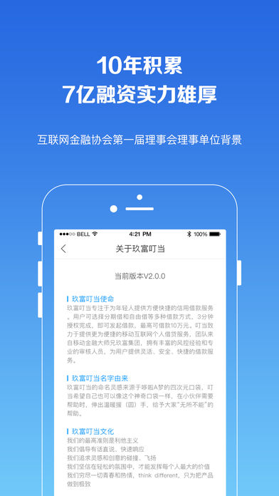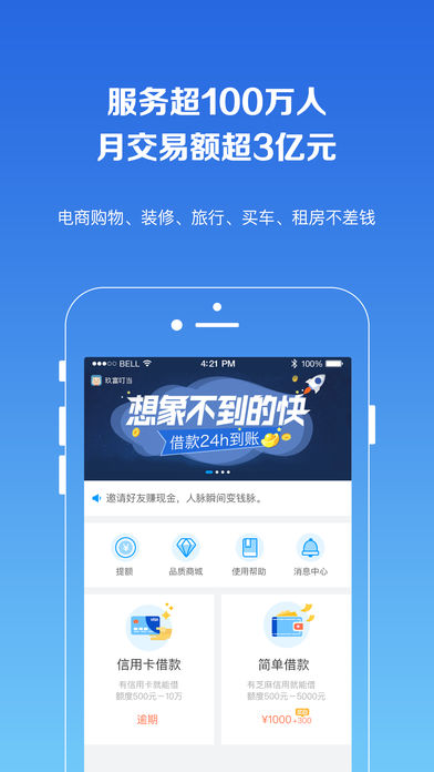 急需个人小额借款?使用玖富叮当专业版,体验信用借贷神器,人脸识别授信,3分钟轻松搞定10万元额度,最快当天到账! 【玖富叮当介绍】 玖富叮当APP(原叮当钱包APP),年轻人专属的智能信用借款叮当钱包。人脸识别授信快速拿额度,用户可凭身份证借款、信用卡借款,享受短期信用借款、个人小额借款、分期借款服务。3分钟授权完成,即可发起借款。叮当团队来自移动金融大师兄玖富集团,拥有丰富的风控经验和专业的审核人员,为有小额装修贷款、购房贷款、买车贷款、电商购物贷款等需求的用户提供灵活、安全、快捷的借款服务。 【玖富集团介绍】 玖富,中国移动互联网金融综合服务平台。公司成立于2006年,致力于基于移动互联网和大数据风控技术为粉丝用户提供简单高效优质便捷的普惠金融服务,为用户创造财富价值。 玖富集团形成了以移动互联网、大数据科技、生态链发展模块为基础,以网络借贷、互联网理财、消费金融、围绕消费场景的供应链金融、大数据评估、资产证券化为核心业务的综合布局。 集团旗下包括:玖富钱包、悟空理财、玖富超能、分期GO、叮当贷、蜡笔分期、闪银Wecash、贷我飞、玖信资产等子品牌。通过“玖创基金”,玖富陆续投资了十多家互联网金融创业企业,玖富集团已经完成了互联网金融生态链的构建。 【多种借款选择】 1. 信用卡借款:只要有信用卡就可以借款,快速审核到账; 2. 简单借款:小额极速借款,若芝麻信用良好,可享受最高5000元额度闪电借款; 【系统审核机制】 1. 系统自动审核; 2. 人工判断并电话审核借款人员详细借款背景和意向; 3. 保证资金流向的方便、快捷和安全。 【安全保障】 1. 富友提供客户账户服务系统 2. 中国金融认证中心(CFCA),对电子交易合同进行认证加密 3. 多家征信机构合作,对借款人的信用信息进行严格的审核评估。 4. 玖富通过全票选举当选中国互联网金融协会第一届理事会理事单位 5. 玖富首批接入央行支付清算协会互联网金融风险信息共享系统 6. 玖富集团通过国家公安部监制信息安全等级保护三级安全备案 7. 玖富成为国家互联网金融风险分析技术平台首批试点接入单位 【联系方式】 叮当微信公众号:叮当钱包。会有在线客服为您服务。 全国客服电话:400-810-8818