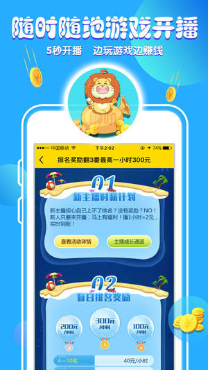#手游玩家月入万元不是梦# 5秒钟即刻开启手机开播,无需电脑,播1小时赚3元,最高可达300元/小时,每日提现,成为手游明星主播月入万元不是梦。 #主播陪你一起玩,5分钟免费上车# 大神带飞,美女陪玩,随时随地就能免费上车,从此游戏不再孤单。 #王者荣耀大神齐聚# 零度、启启、板娘小薇、杰斯、笑煮、老军医、安然、王子、荡浪、老王、GUIMI等知名主播齐聚 #顶级战队和职业赛事入驻狮吼# 集结《王者荣耀》、《穿越火线》、《球球大作战》等超强职业俱乐部如JC、sViper、SC、情久俱乐部等,还有众多精彩的赛事转播内容。 #热门手游全直播# 王者荣耀、穿越火线、球球大作战、狼人杀、我的世界…