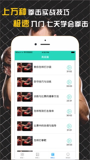 最受拳击爱好者的喜欢的App】 【搜罗了各类精品拳击教程,从入门到提高】 详细介绍了拳击入门基础知识 拳击的步伐,刺拳,摆拳,进攻,躲闪技巧,体能训练,拳法组合,沙袋打法练习等等。。。 练习拳击,强身健体,提高自卫能力!