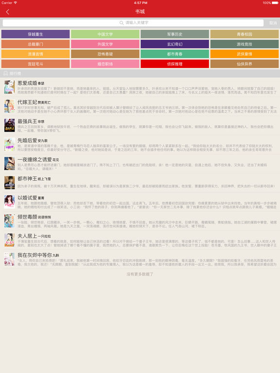 *数百个免费小说书源 *重新排版无杂乱广告 *可下载或在线阅读 *自动更新最新章节 *没有搜不到的图书 更多优势: 1、实时监测:强大的智能监测引擎,为您实时监测关注小说动态,让您第一时间得到最新小说更新章节提醒。 2、简单易用: 改进了传统小说阅读器中多种细节,对于每一个细节,我们都力求最易用,给您完美的用户体验。 3、即点即看: 支持下载阅读和在线阅读两种模式,在线模式让您节省更多硬盘空间,拒绝等待,一点即读。 4、智能书签:不需要您人工操作,系统自动记录您的阅读位置,根据您的阅读习惯,自动排序您的书籍。 5、完美体验:精排的文字,多种阅读配色方案,流畅的翻页,最重要的是永不闪退的稳定。