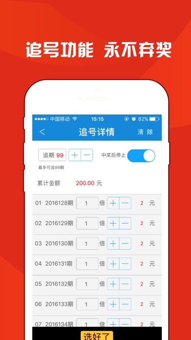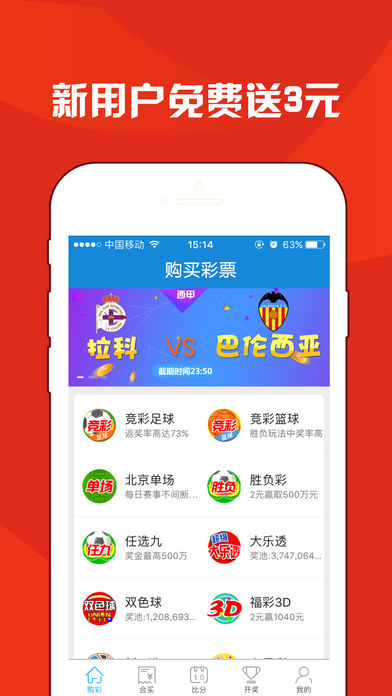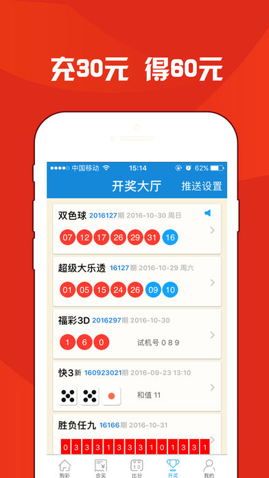 【最新活动】 新用户下载即送3元彩金,免费买彩票 新用户首次充值30元,可得60元 【支持彩种】 双色球,大乐透,竞彩足球,竞彩篮球,传统足彩14场,任选九,北京单场,11选5,福彩3D,七星彩,七乐彩,排列三,排列五 【功能介绍】 1, 购买彩票,支持全国主流彩种以及高频彩种 2, 合买大厅,你出方案我收益,跟的多,中的多 3, 数字彩追号,最多支持99期追号,从此不落下任何一期中大奖的机会 4, 比分直播,最快最准确的足球篮球比分直播,让你亲临现场 5, 开奖大厅,最快的开奖公告,开奖号码自动推送,第一时间得知中奖结果。 6, 彩票数据,最准确的盘口赔率变化及走势图分析