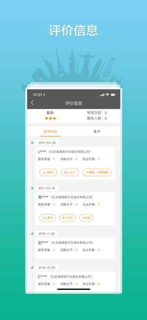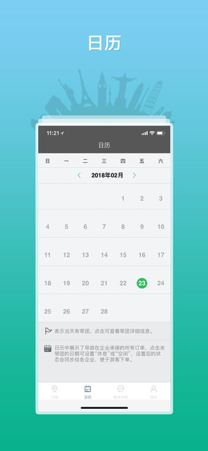 【产品简介】 全国导游之家服务于导游,方便导游随时查看和编辑带团行程,展示电子导游证,管理自己的工作日历等等。行程改变提前通知游客,群发消息随时联系游客,实时接收新闻公告。在全国导游之家,让旅游更舒心! 【产品特点】 行程:查看导游当前带团行程详细信息(游玩景点、餐饮住宿、交通工具、注意事项等),行程改变通过微信公众号通知所有团内游客;扫描导游二维码即可显示电子导游证;接收推送消息,实时了解新闻公告;还可以查看日期、天气信息哦~ 日历:展示了导游在自由执业企业承接的所有订单,点击未带团的日期可设置“休息”或“空闲”,设置后的状态会同步给各企业,便于游客下单。 我的:提供导游的基本资料…