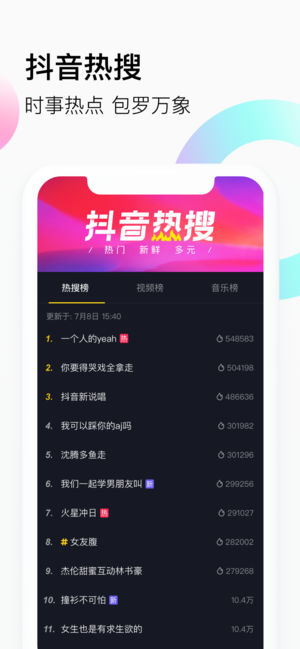 抖音短视频,是中国广受欢迎的原创短视频分享平台。 《明星大侦探》何炅、白敬亭、鬼鬼吴映洁和抖音一起越玩越嗨,办案脑洞大开!罗志祥携抖音明星团空降《快乐大本营》花絮!大张伟魔性推荐!《我想和你唱》李宇春、王俊凯、林忆莲、汪涵、杨迪同台尬舞,《高能少年团》张天爱玩到停不下来! 全球潮流音乐,搭配舞蹈、表演等内容形式,还有超多原创特效、滤镜、场景切换帮你一秒变大片,为你打造刷爆朋友圈的魔性短视频。脑洞有多大,舞台就有多大!好玩的人都在这儿! -全网首创音乐滤镜,声音算法赋予视频新创意! -独家原创音乐,百种音乐风格任你表达自我! -大屏超清画质,带给你全新视觉体验! -人人上热门,不拼颜值拼创…
