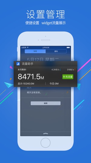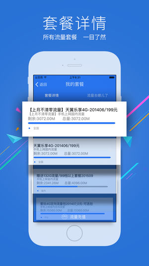 流量营业厅时时监控流量使用情况,杜绝软件偷跑! 【产品简介】 流量营业厅是一款专门为用户定制的集三网流量监控、流量提醒、网络测速等功能于一身的软件。能全面管理您的流量,极大方便您了解流量使用情况及网络情况。 流量营业厅是移动、联通、电信、全民流量充值、网购平台APP,高折扣、价格优惠。再不受wifi束缚,随时无线上网神器。 【亮点功能】 1.流量监控:支持三网流量监控,实时监控,帮助您精确定位流量地图; 2.流量提醒:准确流量预警,帮助您及时避免流量超额; 3.网络测速:专业网络测速,帮助您轻松了解网络状况; 4.智能推荐:采用智能算法,智能推荐所需流量包,更加贴心;