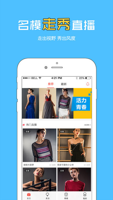 服饰秀—高颜值模特网红互动直播购物平台!买家秀和卖家秀一致! 产品特色: 1. 高颜值网红主播亲身示范穿衣搭配。 2. 网红美女主播和用户实时聊天、送礼互动。 3. 用户可边看直播边购买心仪商品。 4. 商品详情页可看到商品关联的视频,增强商品视觉感受。