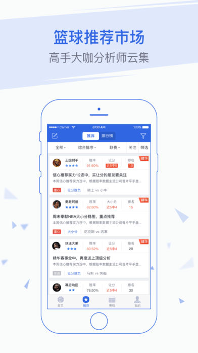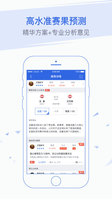 篮球彩票猎手是款快、准、全的篮球彩票赛事推荐分析软件; 集合了独家专业的篮球赛事情报、免费精准的竞彩篮球推荐、篮球赛事盘口走向分析、篮球即时比分!看篮球,可以没有炸鸡,没有啤酒,但不能没有篮球彩票猎手! 【功能简介】 篮球彩票预测分析 千人篮球推荐专家团队分析对比各个庄家即时盘口、赔率走势、历史对赛比分还有类同赛事比分,结合过百万场篮球赛事比分数据、亚盘欧赔等盘口数据,汇集出一个领先的篮球赛事比分大数据预测系统!助你紧贴市场,占尽先机,到投注站玩篮球彩票再也不用纯靠运气! 篮球彩票推荐市场 全国首屈一指的篮球彩票推荐市场!这里有玩篮球彩票命中率高达80%以上的高手分析师!每天过千个篮球彩票分析牛人在这里交流活跃,购彩再也不用彷徨,去投注站玩篮球彩票,这里能做第一手的推荐参考!