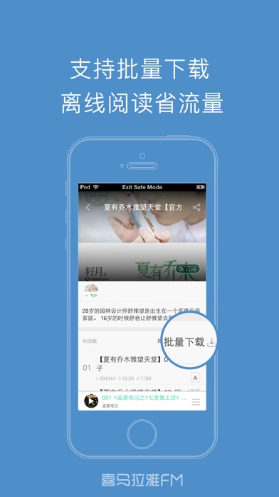 掌上听书神器,海量图书免费听 。 喜马拉雅FM官方出品,畅听百万有声书。 多种分类任你选,爱书之人必备追书神器。 释放双眼,放松心情,带上耳机穿梭在浩瀚书海。 悬疑,言情,玄幻,历史,武侠多种分类随心听。 最优质的主播,高清音质,亿万书友的选择。 ---------------【听书神器.内容简介】--------------- 悬疑:让你无法逃脱的心底深处的恐怖。 言情:最丰富的爱情小说,听你最想听的爱情故事。 幻想:搜罗当下销量最高的玄幻小说,尽显有声玄幻魅力。 历史:多部经典巨作,历史名人传记,为您多方位解读历史。 文学:古今中外名著精选集,带你领略文学的魅力。 武侠:金庸,古龙,梁羽生,用声音圆你武侠梦。 官场商战:探秘中国式官场文化,中国当代官场的百科全书。 经管:收录了时下 经济类图书,使您在闲暇之余,也能够轻松掌握财经、经济学的脉络。 社科:社会科学,名人自传,一起探讨社会热门话题,解读当下。 ...... 对于产品如有任何疑问和建议,请联系我们 网站:http://www.ximalaya.com 客服QQ:4008385616 新浪微博:http://weibo.com/ximala 腾讯微博:http://t.qq.com/ximalayacom 客服电话:400-838-5616