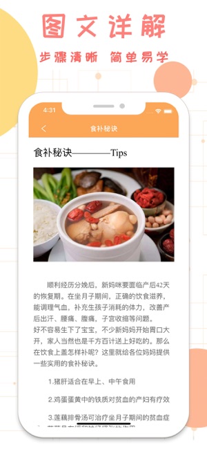 经历十个月的辛苦怀胎,健康可爱的宝宝终于降临!可宝妈们的身材却做出了巨大牺牲,怎样既健康又快速的恢复完美身形? 月子食谱为处在坐月子期的妈妈提供健康营养的饮食搭配,让您的身体以最快速度恢复完美! 每道菜谱有具体的简介,材料,做法,让您吃的安心!