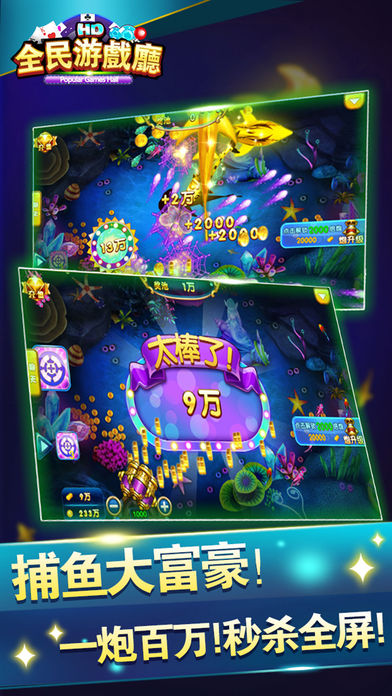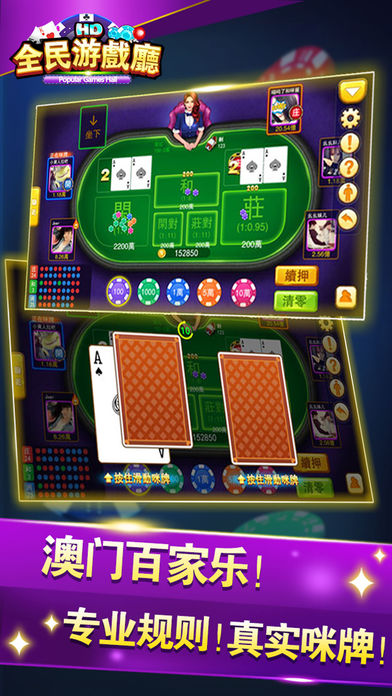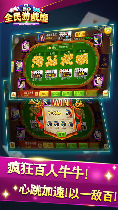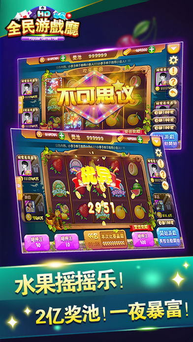 新手登陆即送10万金币!银行自由存储掌控资金! 《全民游戏厅HD》强势来袭!一键登录,无需注册,全民体验电玩城的心跳刺激! 【澳门百家乐】 最流行的娱乐场游戏!体验完全真实咪牌过程,让玩家主宰自己的命运,还原澳门娱乐场现场的紧张激动!专业澳门路单规则,珠盘路、大路、大眼仔、小路、曱甴路,精准分析预测牌局走势,助您路路顺!路路发! 【水果摇摇乐】 经典30线水果SLOTS游戏,更多押注彩线,更高中奖概率。小投入大回报,最高2000倍押注奖励和上亿金币奖池奖励等你来拿!支持自动转,还有额外BOUNS小游戏,轻松愉快,惊喜不停! 【疯狂百人牛牛】 乐趣横生的斗牛游戏!四门任意押注,玩家轮流上庄!无限制押注的疯狂!以一敌百的刺激!抓住机会,就能空降赌神榜,赢得万人瞩目!还有五小牛五花牛赢取上亿金币奖池! 【捕鱼大富豪】 开启万倍炮塔,一炮百万!不但有锁定、冰冻、核弹、急速、狂热等强力技能,还有涨潮、任务、副本、奖池等场景挑战。丰富的海底鱼群、丰厚的奖池奖励,支持4人同桌、自动开炮,还原街机捕鱼刺激体验! 【金砖摇摇乐】 挑战比赛金砖SLOTS!多人对战型SLOTS,报名人数越多,挑战越大,奖励越丰厚!无限制支持所有玩家报名!等待时可正常进行游戏,限定5分钟,谁能越战越勇? 【更多特色】 无需注册,一键登录,首次登陆送10万金币助您畅玩! 每天登陆幸运转盘额外赠送金币礼物,最多送20万金币! 礼物系统让您同天南海北的好友一起分享游戏的乐趣! 断线重连、自动托管、自动结算等人性化设置,不怕断网受损! 《全民游戏厅HD》让您身临其境感受电玩城中押注的刺激,中奖的心跳! 如果您有任何意见或建议,您可以在游戏中直接进行反馈;因苹果评论无法回复,您也可通过以下方式联系我们,祝您游戏愉快! 客服联系QQ:2295305291 email:2295305291@qq.com