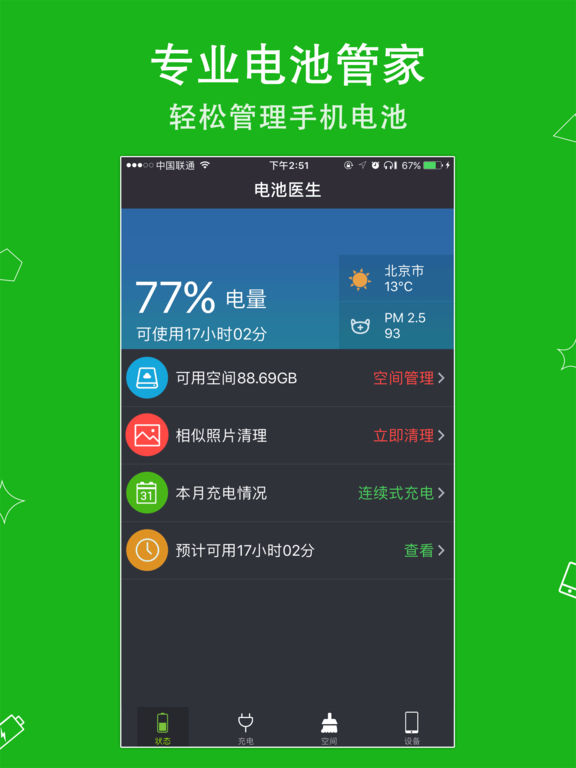 好用的电池医生来了! 杜绝虚假宣传!给你带来最实际的功能! 面向全球发售,简单,易用!功能全面! 准确的信息显示让你轻松管理! 【特色功能】 1.充电监控:最易用,最华丽的完全循环充电软件,更重要的是完全免费! 2.电池用量:准确预估电池可用时间 外出不必担心电量不足! 3.系统信息:精准系统信息显示,轻松了解系统运行状况! 4.天气提醒:精准告诉你今日天气状况,雾霾情况!