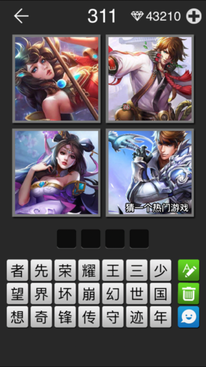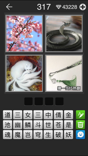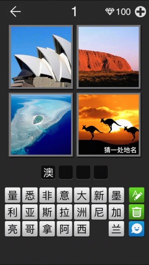 四张图猜一个词,寓教于乐的火爆猜图游戏!谜题包括热门影视,漫画动漫,美食世界,人文历史,名胜古迹!包罗万象的题目,让你冥思苦想后又增长了知识~ 小伙伴们,开动脑力,发散思维,挑战你的猜图能力吧^o^