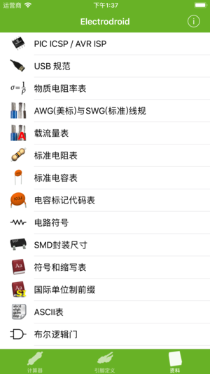 ElectroDroid PRO 是一个简单而强大的应用,包含了大量电子类工具和参考资料。 专业版不含广告,比免费版增加了更多功能。 包括: • 电阻色环(码)解码 (3-6 环,包括阻值反查色环码); •SMD电阻代码; • 电感色环(码)解码; • 欧姆定律计算器; • 电抗计算器; • 分压器计算器; • 电阻比值、电阻值/电阻串联/电阻并联计算器; • 电容充电计算器; • 运算放大器计算器; • LED(发光二极管)限流电阻计算器; • 可调稳压器/LM317计算器; • 散热计算器; • 电池寿命计算器; • 电感设计工具; • 电压降计算器; • PCB走线宽度计…