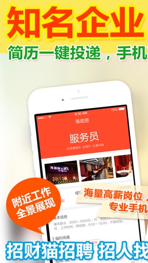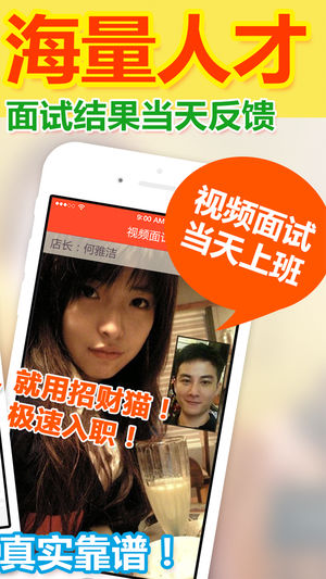全国高薪急聘工作,每日更新! 招聘找工作必备神器! 【招财猫招聘 】 全行业快速招聘平台!基于地理位置,寻找附近靠谱的好工作或人才,和企业老板直接手机面试,视频面试,最快当天上班!急招人、急找工作的必备神器! 招财猫招聘,重新定义手机招聘! 招聘求职找工作最新神器,老板直招,视频面试,当天上班,可以寻找同城全职或兼职、实习的工作机会! 严格监督招聘行为,让求职者找工作找得放心! 【高薪工作,每日更新】优选全国高薪招聘职位,让招聘方和求职者都能看到最新更新的信息 【视频面试,当天上班】手机电话、语音、视频多种面试方式,不必为面试来回奔波 【加急招聘,一呼百应】独有加急模式,体验过才知道这才…