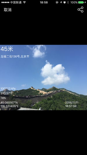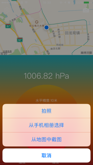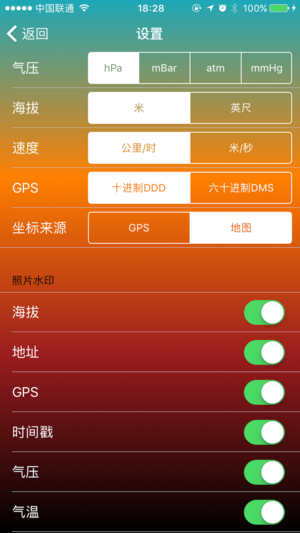 海拔气压表是一款包含地理位置、GPS、海拔、气压、气象、方向等信息的测量工具;同时提供水印相机功能,以水印形式在图片中添加测量信息,方便取证、记录。可供在旅游、工作途中需要测量记录地理信息的人使用。 本应用包含的功能: * 地图,包含定位地理位置功能 * 实时海拔高度 * 实时移动速度 * 气象信息 * 指南针 * GPS * 实时气压(需iPhone6及以上型号) * 水印相机,提供相机、手机相册、地图截图三个图片来源 * 可自行选择各项测量数据的单位 * 可自行选择需要在图片中出现的水印