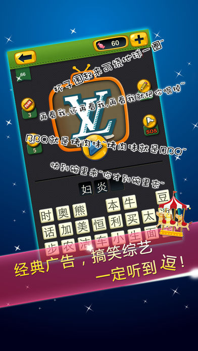 天天疯狂猜声音! 快来加入我们声战江湖吧! 这是一个声音的世界,需要你用耳朵来探索,快快竖起你的耳朵加入进来吧。 搞笑的小品相声片段,恶搞的综艺节目,经典的电影电视剧台词,永远忘不了的广告台词,甚至是红白机的童年记忆,你都可以听的到。 聚会的时候和朋友们一起回忆一下那曾经年少青葱的声音,给大家带来更多90后80后回忆,更多感触,更多欢笑! 让你在充满声音的趣味猜谜游戏中,体味经典,唤起你的记忆与感动。 定期更新关卡,不再无限期的苦恼等待。 土豪们快来加入疯狂的世界,每天来点快乐的声音吧! 【联系我们】 关注疯狂的声音,定期会有送礼包大抽奖活动,惊喜不断! 客户端使用方面有任何问题、意见和建议可以通过以下方式联系到我们 * 微信号:doodleroom2013 请关注“疯狂猜声”官方微信 * 新浪微博:http://weibo.com/fengkuangcaisheng 请关注“天天疯狂猜”官方微博 * 服务邮箱:doodleroom2013@gmail.com 关卡下载更新声明: 由于游戏关卡是需要联网下载,有些用户在网络不好或者没有网络环境的情况下,无法更新下载关卡。 出现这种情况后,请大家双击IPHONE的home按键,彻底关闭我们的游戏,再重新启动,就可以继续下载游戏关卡了。 针对升级的用户,前三大关有部分答案错误,小编表示十分抱歉,特别呈上对应答案: 第一大关中音频“刘谦”,正确答案应为“超级玛丽” 第二大关中音频“赵本山”,正确答案应为“马戏团” 第二大关中音频“小龙人”,正确答案应为“泡泡堂” 第三大关中音频“斗地主”,正确答案应为“西游记” 第三大关中音频“魂斗罗”,正确答案应为“脑白金”