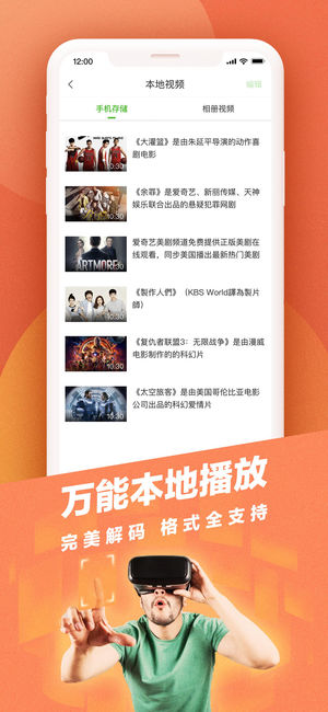【为你精选优质VR视频】 1. 全景视频:近距离与各种小姐姐亲密接触;模拟体验极限运动、鬼屋探险,上天入地纵览太空、深海、世界奇观;带你开脑洞进入科幻世界,带你击破次元壁化身二次元角色。 2. 3D大片:好莱坞震撼3D大片+虚拟巨幕影院=你自己的私人观影厅。 3. 互动视频:身临其境参与故事情节、紧急时刻改变故事发展,VR的世界里,你是导演。 【带你玩遍全球VR游戏】 1. 鬼吹灯之牧野诡事VR:化身摸金校尉,探秘荒村古墓 续写摸金传奇。 2. 萌宠大人VR:一键云养狗 汪星宝宝求带走。 4. 灵域VR:经典国漫IP改编,承完美血脉、战万古苍穹! 【给你最好用的本地播放器】 1. 最清晰:支持…