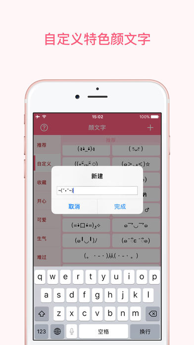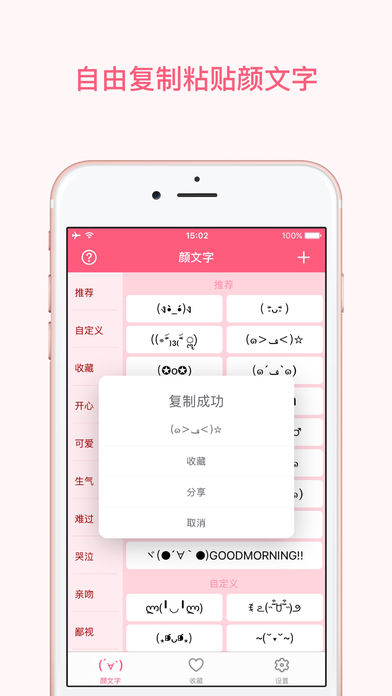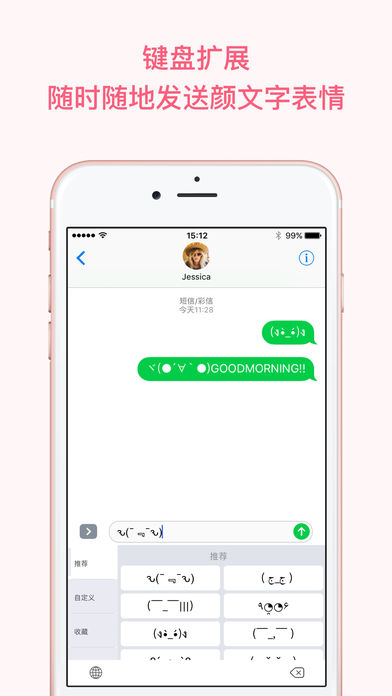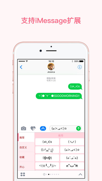 颜文字大全,内置上百款经典好玩的表情文字,让你的聊天更生动有趣 -内置1000+ 颜文字,分类清晰,你的喜怒哀乐全在这里。 -支持iOS 10 iMessage 扩展,可作为表情键盘使用,直接插入这些有趣的表情 -点击即复制,简单方便,在微信,QQ,微博等任何应用直接粘贴使用。 - 500 多款表情还不够用?没关系,你可以创建并自定义任何你喜欢的表情。 -收藏功能方便将你喜欢的颜文字表情添加到收藏夹。 还不赶快加入 iMessage表情包大战?