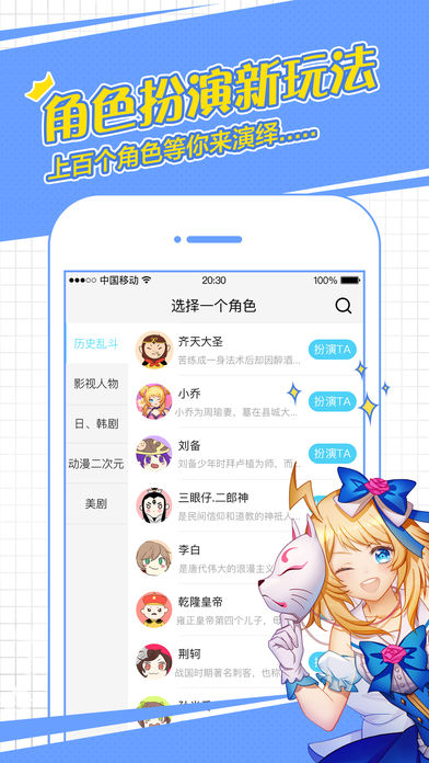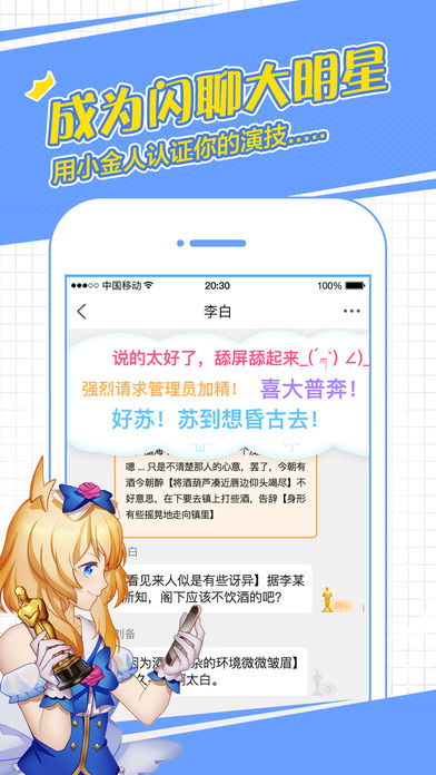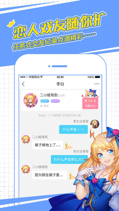 闪聊2.1新版—求勾搭功能上线啦,恋人or戏友随你撩! ヽ(゚∀゚)メ(゚∀゚)ノ 闪聊是一个年轻又有趣的交友平台,这里有软萌好看的小姐姐,暖心又有趣的小哥哥,还有各种热门群聊圈子加入,快速找到懂你的新朋友! --------------------------------------------------------------- 【求勾搭】 每天推荐超多有意思的小伙伴,发现喜欢的恋人or戏友快速扩Ta,同一次元就能马上开撩! 【场景对戏】 给聊天添加剧情场景,像在小说电视剧里一样聊天!还有聊天互动小游戏,初次见面不怕没话题~! 【群聊圈子】 同好邀请你一起组队啦!在这里,你可以找到属于你的小世界! 【声控社】 不看脸只听声音交朋友,发现身边的好声音~ 【演技认证】 聊天戏好就送你小金人 !实力演技认证! 闪聊未来影帝影后就是你~ 【角色扮演】 你喜欢的角色都在这里!百变身份等你演绎~变身成你最爱的二次元角色吧! ----------------------------------- 如果在使用闪聊时遇到任何问题,请一定要微博 @闪聊,小闪会及时回复大家哟~ 或App内私信小闪,欢迎勾搭~