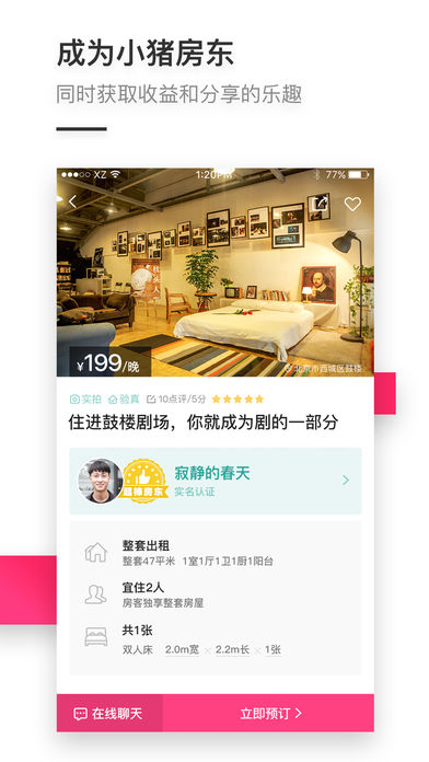 小猪(xiaozhu.com)是国内最大的特色民宿和短租房预订平台,更是一个充满爱与人情味的社交住宿社区。小猪在全球300多座城市拥有超过20万套优质房源,包括别墅、民宿、树屋、花店、剧院、书店等,让旅途中的你充分感受住宿之美、人情之暖、分享之乐。 作为国内最大日租短租房、酒店式公寓和民宿的在线预订平台,小猪让你的出行更多选择,更加自由。你可远离千篇一律的酒店,栖息于山海之间,酣睡在市井胡同;你可像在家里一样洗衣做饭,与朋友同事聚会,还有出差、培训、考试、求学、求医等多样化需求都可得到满足。 你可随时随地打开小猪APP,选择自己喜欢的特色房源或房间,查看房源照片,了解房源和房东的介绍及价格信息,并与房东进行在线沟通,第一时间掌握这些短租日租房、民宿客栈或是酒店式公寓的详情,轻松完成住宿预订。你还可以从房东那里了解到最正宗的当地文化和旅游信息,完美规划自己的旅程。 从北京到三亚,从海边到深山。无论冰天雪地的漠北,还是万绿归宗的云南,只要打开小猪APP,小猪都能为你和家人、朋友开启一段奇妙的旅程,让你自在居住中体会小猪的理念——居住自由主义。 亲爱的你,欢迎来到小猪,去住有趣的房子,遇见有故事的房东。 无论你是想了解小猪,预订小猪的房源,还是想成为小猪的房东,我们随时欢迎你的联系: 小猪客服:400-010-7890 小猪微信:小猪短租网(ID:xiaozhuduanzu)小猪短租(ID:xiaozhunite) 小猪微博:小猪短租网