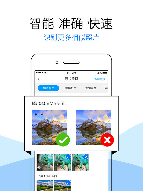 - 功能 触发系统空间管理 快速扫描iPhone,iPad上的相似照片,一键清理所有相似照片 扫描iPhone、iPad视频 智能筛选出相册中占用内存的大视频,批量清理大视频 - 优点 快速清理相似照片与大视频,节省手机空间! - 点赞 清理君非常期待您的反馈,喜欢那请给五星好评,有任何意见也可以给我们评论,让我们不断的更新,为您提供更多更好的功能。