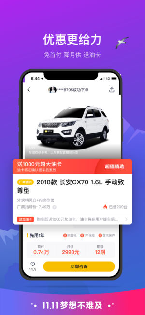 弹个车——大搜车旗下全新汽车金融产品,阿里巴巴和蚂蚁金服联合战略投资。 【1成首付,0保证金】 拒绝传统高首付,弹走你的购车门槛! 购车首付只需10%-20%,含购置税/过户费,送1年保险。选择空间更大,资金占用更少。 (首付比例基于蚂蚁金服信用体系评估,信用越高首付越低) -----满一年可买可退----- 在弹个车买车,用满一年自由选择继续租车、全款购车、分期购车、退还车辆。可买可租可退,弹出个性。 -----购车尾款可分期----- 购车车款期末可一次付清,尾款最长可享三年分期,弹走压力。 【信用购车,全程包办】 -----信用购车,先用后买----- 不需额外保证金…