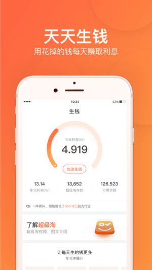 超级淘版本介绍: 1.一键购买主流电商平台商品,花钱实惠又便捷。 2.线下商家消费接入平台,美食娱乐购物花掉的钱直接存入。 3.在平台累积的花钱金额,每天产生利息收益,稳稳地为您生钱。 4.平台福利多多,摇红包,分享奖励,邀请奖励等,让收益轻松提升,生钱更多。