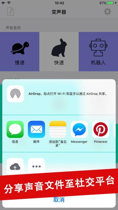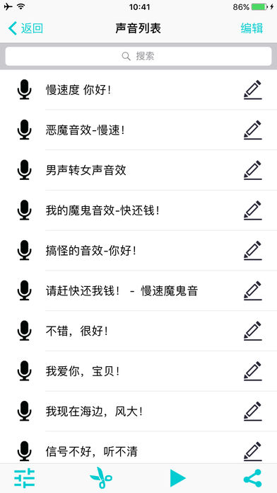 功能最强大的超级变声器! 您是否觉得普通的录音机功能太普通? 您是否想把自己的声音通过变声音效变得更有趣? 这款应用可以让你改变自己的声音并添加各种有趣的音效。您可以把一个女孩的声音变成男孩的,也可以把一个老伯的声音变成小孩的声音。通过内置的分享模块,您还可以把变声后的声音分享出去。非常有趣! 声音音效包括: 女孩,妇女,男孩,男人,恶魔,女鬼,慢速,快速,机器人 场景音效包括: 沙滩,电话,掌声,气泡,欢呼,咳嗽,海豚,冲水,吉他,燃烧,幽灵,大浪,恐怖,水中,夜晚,昆虫,闪电,尿尿,雨声,划艇,淋浴,急流,海浪,警报声,打鼾,火车,对讲机,溪流,水泡,水滴,瀑布,雨刮声,风声 特性功能: * 实时录制您的声音 * 用户可自行添加自己的场景音效,或者保存自己设定的声音音效参数 * 裁剪已录制好的音频或者导入的音频 * 可从手机音乐应用导入音频至场景音效 * 随时随地分享您的音频给您的朋友