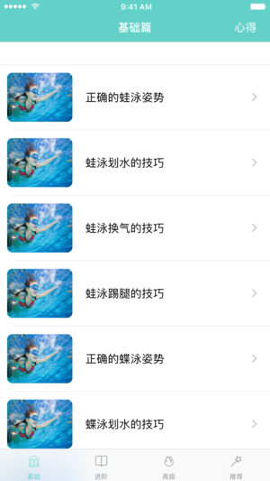 游泳是一项需要较高技巧的体育运动,初学者在学习过程中会遇到很多障碍。本应用汇集了蛙泳、自由泳、 仰泳、蝶泳等基本泳姿的学习方法,采取图文并茂的方式把泳姿的学习呈现在用户面前。 还详细整理了在入水前所要进行的准备,让你轻松掌握多个游泳技能!是你学习游泳的必备应用。