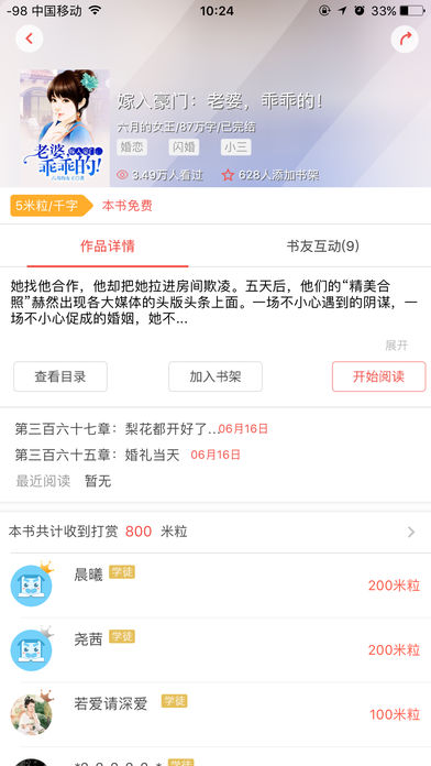 一款打破传统书架式的移动阅读应用,用清爽的UI界面第一时间展示最新鲜最热门的小说作品。引入了WAP站优质的网文资源,提供诸多书籍分类,以丰富的资源来满足阅读需求。最萌态的动画效果,调皮的米宝宝能瞬间萌化任何人。多样的手势操作,清晰的目录导航,自定义字体、背景、日夜阅读模式等,打造最优质的阅读体验。