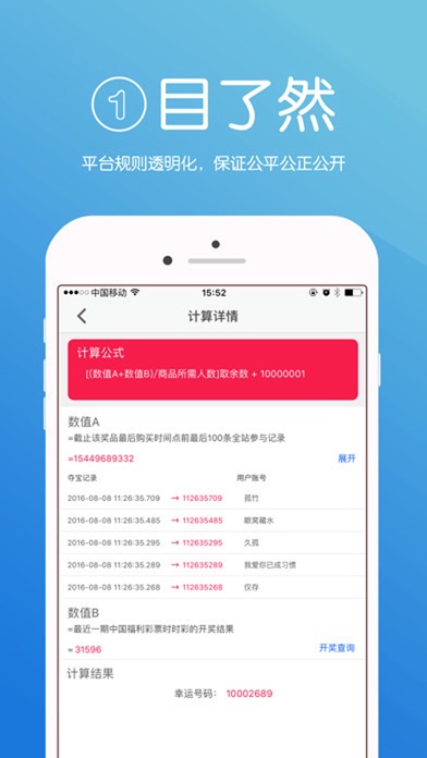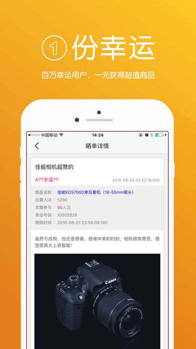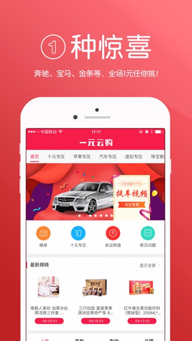 一元云购是一种全新的互动购物平台,是时尚 、潮流的风向标,能满足个性、年轻消费者的购物需求。力求打造一个100%公平公正、100%正品保障、寄娱乐与购物一体化的新型购物APP. 【海量商品】 休闲食品、家居洗护,儿童玩具、黄金首饰、电子数码,手机平板!总有一款让你心动 【全新玩法】 每件商品您只需投入1元钱,即可获得一个“夺宝码”,每件商品可多次参与, 参与次数越多,获得商品机率越大;当然,您也可以一次购买多个“夺宝码”;每件商品设有所需参与人数下限,只要参与人数达到总需购买人次,系统即会根据计算公式抽出一位幸运者,由这位幸运者获得这件商品。幸运轮流转,每个人都有机会在投入1元钱的成本下获得商品,心动就在眼前。 【公平公正】 中奖号码计算方式完全公开可查 【奖品晒单】 快来看看别人在一元云购收获的喜悦,已经有3000+用户分享了晒单!