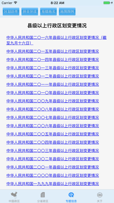《中国行政区划地图(2016版)》介绍了我国行政区划、区划沿革变动等内容。通过本产品您可以快捷的查看全国、省级、市级、县级行政单位的隶属关系及相关介绍。产品的数据由国务院批准的全国县级以上行政区划资料汇编而成,权威、准确。 本软件来自专业权威的编写机构——中华人民共和国民政部和中国地图出版社强强联手打造,是必备的工具软件:准确、翔实的县级以上行政区划信息;全国、省级、县级多级跳转;点击显示县级以上地名信息,包括行政区划代码、区号、行政级别、下级单位个数、人口、面积等等。全新的视觉体验——使用了全彩地图,形式更加活泼,使用更加方便。简洁易用——本产品充分利用移动平台的新特性,将多点触摸、浮动显示等iPad特点与地图结合展现。更新及时——与民政部网站同步更新。同时,软件含有搜索查询功能,可实现地图及相关数据信息查询检索。