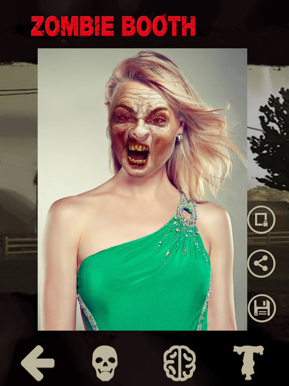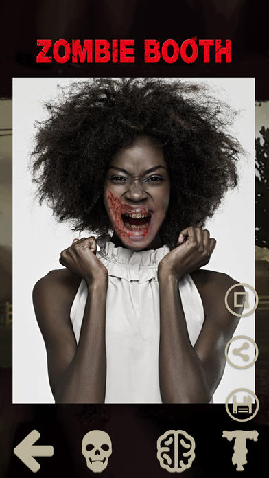 僵尸相机可以改变你的脸变成僵尸脸,让你分享与家人或朋友的照片 ===特点=== *50+僵尸脸图片 *自由添加文本 *50+僵尸贴纸 *通过Facebook,Twitter,电子邮件或信息分享图片。