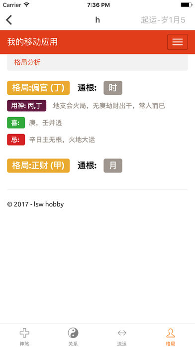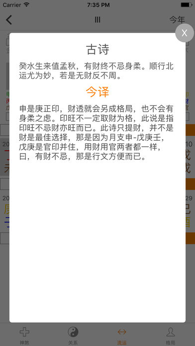 网络上有很多八字排盘软件,没有一款是提四柱拱夹显示并且对拱夹进行冲刑合会分析功能的,通过对梁湘润老师所著的《四角行冲合会》一书和 《金不换大运》《天元巫咸经》的深入研究,特此开发一款便于专业人士分析和业余人是学习的App,2.0版会提供有关“格局”,“用神喜忌”,等对专业人士和业余人士学习的多项帮助功能,敬请留意。 使用中有问题或建议请发邮件至 lswlester@hotmail.com 或加微信15900339338进行咨询 ---八字排盘 专业版 1.9 1.提供神煞注解显示 2.提供大运解释与分析 3.提供免费流年人工批断 4.提供大运所属年龄周期显示 5.提供当前年龄显示 6.提供当前流年显示 7.提供阴历日期选择功能 8.提供资料列表性别颜色区分显示 9.提供流月选择功能 10.提供拱夹显示设置功能 11.提供备份导出已存八字资料功能 12.提供格局喜忌参考功能 13.提供空亡显示功能 14.提供中国所有地区真太阳时查询功能 15.提供早子时/夜子时设置功能 16.提供格局智能分析功能 17.提供资料备份功能 18.提供资料导入功能 19.提供资料排序功能 20.提供姓名/年份查询共呢个 ---八字排盘 精简版 1.阳历自动转换阴历排出四柱功能 2.天干冲合显示 3.地支冲合显示,三和三会提示 4.地支拱夹提示 5.五行颜色区分 6.四柱所属旬提示 7.四柱自坐提示 8.流年大运选择 9.四柱神煞提示