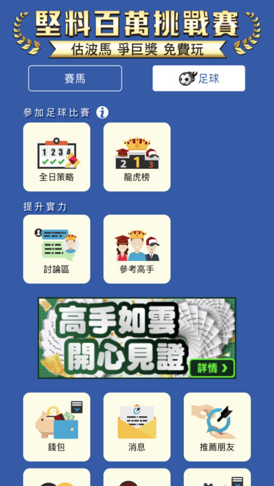《百萬挑戰賽》 用戶只要下載「堅料」手機應用程式並註冊成為會員後,便能自動獲得參賽資格。 由比賽開始日期起計算,只要攀上任何一個賽馬或足球龍虎榜的神級級別(即 ≥90分),並最快成為當天最高分數者,便可獨得港幣一百萬元的獎金及百萬挑戰賽冠軍合約。 「堅料」乃由亞勢備份軟件開發有限公司(港交所股票代碼:8290)完全擁有的子公司,完全受證券及期貨事務監察委員會監管,財務隱健,運作透明,乃絕對可信的第三方。 不必再猶疑,立即試玩,費用全免。