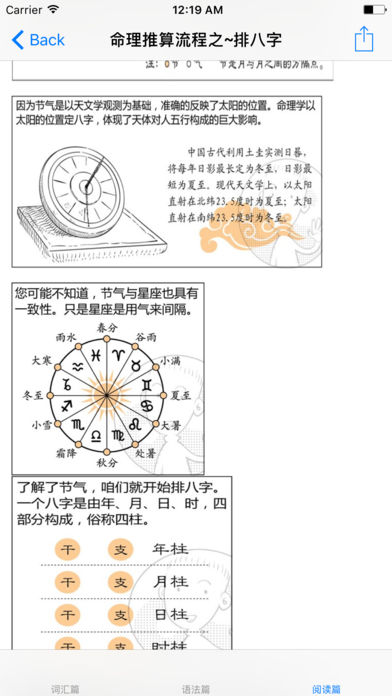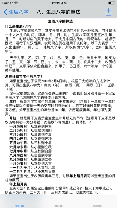 《生辰八字大全》是一款全面介绍八卦知识、为您揭秘生辰八字的App。 内容涵盖了生辰八字所有内容,教您自己学会算卦、认识生辰八字的学问。 -----内容目录涵盖:天干地支|月份|日子|时辰|生辰八字怎么看|八字分析|生辰八字与五行|生辰八字的算法|八字预测婚姻|生辰八字算命分析详解|八字的五行定义原则 五行与数字 *****中国汉字五行属性查询:1画~30画 *****漫画解析八字算命:解析八字命理|八字命理基础之~阴阳五行|天干地支推算规则|十神六亲|纳音神煞|排八字|排大运|何为用神|命理推算流程之~旺衰法|命理闲扯之~有钱人为什么喜欢算命 ~~~~~新浪微博:http://weibo.com/u/5479649208 ~~~~~QQ群:370105102