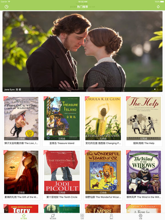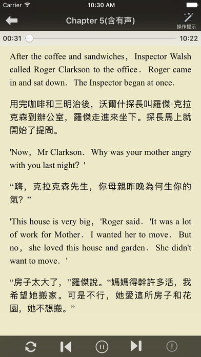 全部免费,没有任何限制!!! 这里有1000+本经典的中英文双语小说,中英文双语对照阅读,真人有声阅读,“听、读、译”最佳配合学习英文,是您学习英文的最佳工具! ==【牛津书虫】== 《一个国王的爱情故事》《世界上最冷的地方》《五个孩子和沙精》《亡灵岛》《哈克贝利·费恩历险记》《在月亮下面》《威廉·莎士比亚》《格林·盖布尔斯来的安妮》《歌剧院的幽灵》《潘德尔的巫师》《爱丽丝漫游奇境记》《爱情与金钱》《猴爪》《苏格兰玛丽女王》《象人》《鲁滨逊漂流记》 《三十九级台阶》《三怪客泛舟记》《不平静的坟墓》《公正》《勃朗特一家的故事》《化学秘密》《化身博士》《双城记》《圣诞欢歌》《多里安·格雷的画像》《小妇人》《巴斯克维尔的猎犬》《弗兰肯斯坦》《星际动物园》《曾达的囚徒》《格列佛游记》《爱丽丝镜中世界奇遇记》《牙齿和爪子》《神秘及幻想故事集》《秘密花园》《织工马南》《诱拐》《野性的呼唤》《金银岛》《风语河岸柳》《黑骏马》 《傲慢与偏见》《呼啸山庄》《大卫·科波菲尔》《彼得·潘》《我的生活》《简爱》《苔丝》《远大前程》《远离尘嚣》《雾都孤儿》 ==【畅销小说】== 《“干谷”约翰逊的小阳春》《一个陌生女人的来信》《一千打》《一千美元》《一块牛排》《华而不实》《圣贤的礼物》《城市佬》《女巫的面包》《姑娘和骗局》《带天窗的房间》《带家具出租的房间》《度夏的人们》《心理》《执迷不悔的简》《扶乩》《新婚的姊妹们》《最后一片藤叶》《沙漠里的爱情》《没有结局的故事》《点金术》《热爱生命》《爱的牺牲》《矮小考古家的奇遇》《竞选州长》《羊脂球》《美妇人》《老头子同盟》《肉中刺》《胆小鬼,内戈雷》《范妮与安妮》《菊香》《警察与赞美诗》《遗孀》《项链》 《一次电话交谈》《一次神秘的拜访》《与睡神抗争》《丛林中的孩子》《两个骗子》《两位感恩节的绅士》《中国人约翰在纽约》《二十年后》《人生的五种恩赐》《使圆成方》《光脸熊》《决斗》《击退登船的人》《办公室里的讨厌鬼》《华盛顿将军的贴身黑男仆》《口信》《古老的泰孔德罗加》《同病相怜》《咖啡馆里的世界公民》《哈里发和莽汉》《唱歌课》《回合之间》《圆脸》《圣经故事全景画家》《夜阑》《姑娘与习惯》《威廉·菲普斯爵士》《威廉三世的肖像》《安宁的长袍》《小小说》《得了条明眼狗》《德国学生的奇遇》《性的魅力》《我姨妈的奇遇》《我的前参议员秘书生涯》《我的首次文学冒险》《战争》《接受采访》《斯芬克司》《森珀·艾德姆》《殡仪员的闲谈》《沙姆罗克·乔尔摩斯历险记》《波普金斯历险记》《海盗基德》《漫谈理发师》《爬上陡坡》《爱尔兰的“教派口号”》《猎捕狡猾的火鸡》《生活的陀螺》《男爵夫人的妹妹》《画册的一页》《真实的自我》《科学对阵运气》《空中冒险》《第一台打字机》《篝火旁的纽约》《红死病魔的面具》《约翰·英格菲尔德的感恩节》《经过修订的讣告》《老秃子》《自然调节》《英俊的船舱侍者》《英国人历险记》《英国还是男人的国家吗》《言语的力量》《诗人与乡巴佬》《诙谐自传》《越野滑雪》《躺在床上的危险》《轮到她了》《运气》《钟摆》《餐后致辞》《饲养家禽》《麦克的赎金》《黄狗自传》《三叶草和棕榈树》《世界公敌》《业余爱好者之夜》《两只蓝鸟》《以活下去为职责的人》《你摸了我》《像古代的阿格斯》《叛逆者》《只是肉而已》《同木乃伊对话》《在北部的森林里》《塞缪尔》《太多金子》《太阳》《女人的刚毅》《年轻的古德曼·布朗》《强者的力量》《当世界还年轻的时候》《当艾丽斯向上帝告解》《恐怖时期的一段插曲》《意外》《拳头》《故事的结局》《新型加速剂》《新天方夜谭》《春天的阴影》《棕色的沃尔夫》《水晶蛋》《沃尔弗特·韦伯或黄金梦》《海滨惨剧》《焦油博士和羽毛教授的疗法》《玫瑰花园里的暗影》《疑犯从宽》《白丝袜》《笔杆子、画笔和毒药》《纳姆-博克,不诚实的人》《终结》《美人李婉》《胎痣》《花园茶会》《菲尔米亚尼夫人》《萨姆森和德莱拉》《远在他乡》《迟来的旅客》《金光》《闪锌矿的卖主》《陈阿春》《马普希的房子》《马贩子的女儿》《骑木马的优胜者》《魔鬼和汤姆·沃克》《麻风病人库鲁》《黄金谷》一只狗的故事》《一杯茶》《一桶白葡萄酒》《一篇有趣的文章》《丢脸先生》《为赶路的人干杯》《人生如戏》《作画》《克里斯·法林顿——一等水手》《公主与美洲狮》《再见,杰克》《哈里发、丘比特和时钟》《唷!唷!唷!》《回乡》《在江户海湾》《在流口水病房里讲的故事》《在甲板的天棚下》《坎特伯雷的朝圣者》《基斯,老基斯之子》《墙上的那些画》《复活日那天》《失语漫游》《女掌柜》《小水仙》《巴格达之鸡》《帕克妈妈的一生》《带磨坊的教堂》《带翅膀的勒索信》《年轻强盗的故事》《幸福》《强盗首领的故事》《形体的永恒》《彩虹的尽头》《恭贺佳节》《手稿中的魔鬼》《托宾的手相》《最后的处方》《最后的行吟诗人》《有伤疤的人》《杀人》《歧途末路》《气球骗局》《泰拉奇纳的旅店》
